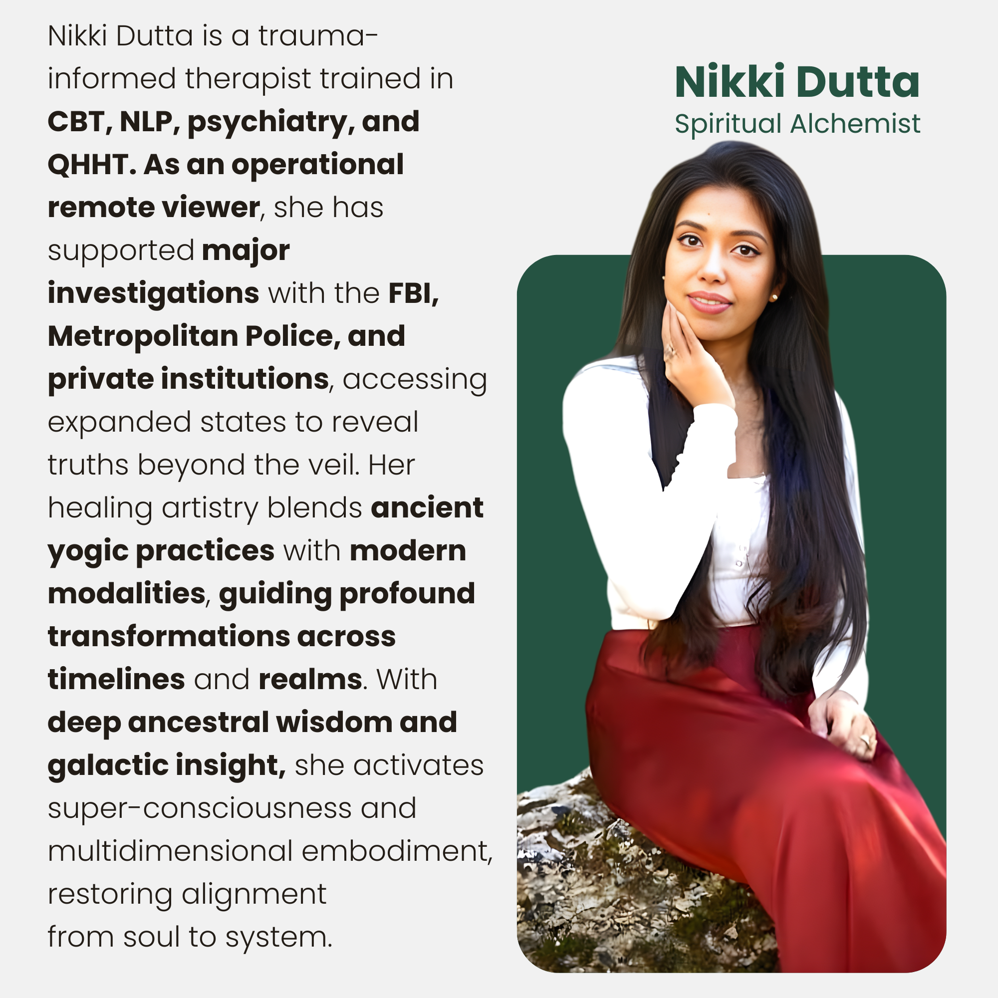 Nikki Dutta is a trauma-informed therapist trained in CBT, NLP, psychiatry, and QHHT. As an operational remote viewer, she’s supported major investigations with the FBI, Metropolitan Police, and private institutions, accessing expanded states to reveal truths beyond the veil.