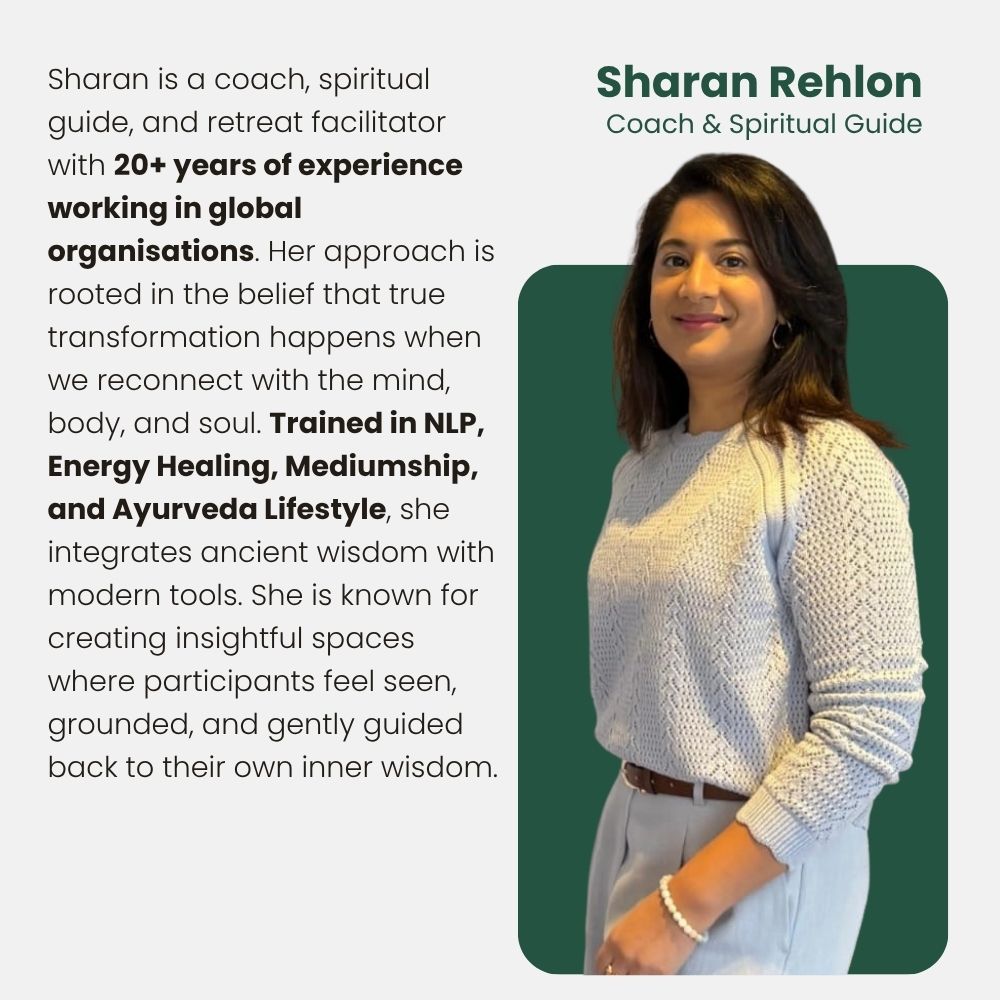 Sharan is a coach, spiritual guide & retreat facilitator with 20+ years of experience working in global organisations. Her approach is rooted in the belief that true transformation happens when we reconnect with the mind, body and soul and bring our whole selves to life and work.