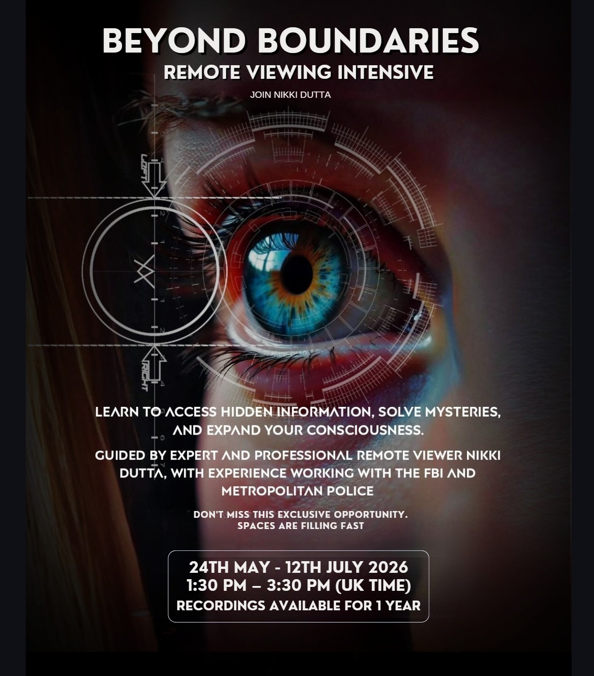 Join Nikki Dutta, internationally recognized remote viewer, psychic detective, and multidimensional educator, for a transformative 8-week journey into the unseen. With years of operational experience assisting in missing and cold cases alongside the FBI and Metropolitan Police, Nikki now shares her expertise with seekers worldwide.